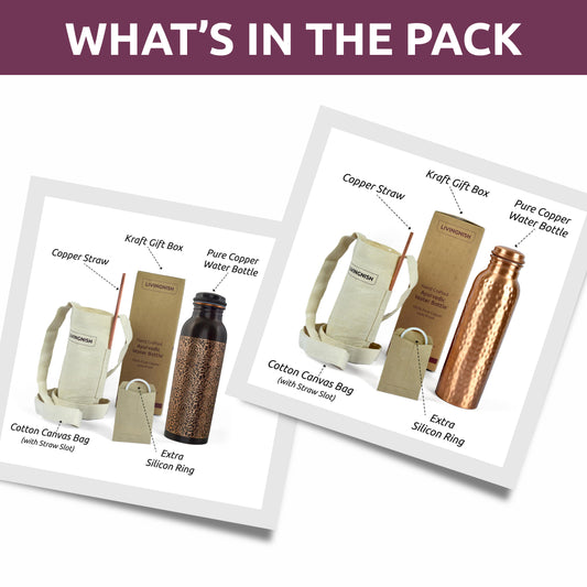 100% Pure Ayurvedic Copper Water Bottle- 8 Pcs Set (2 Bottle, 2 Straw,2 Extra Silicon Ring and 2 Cloth bags) AQHN