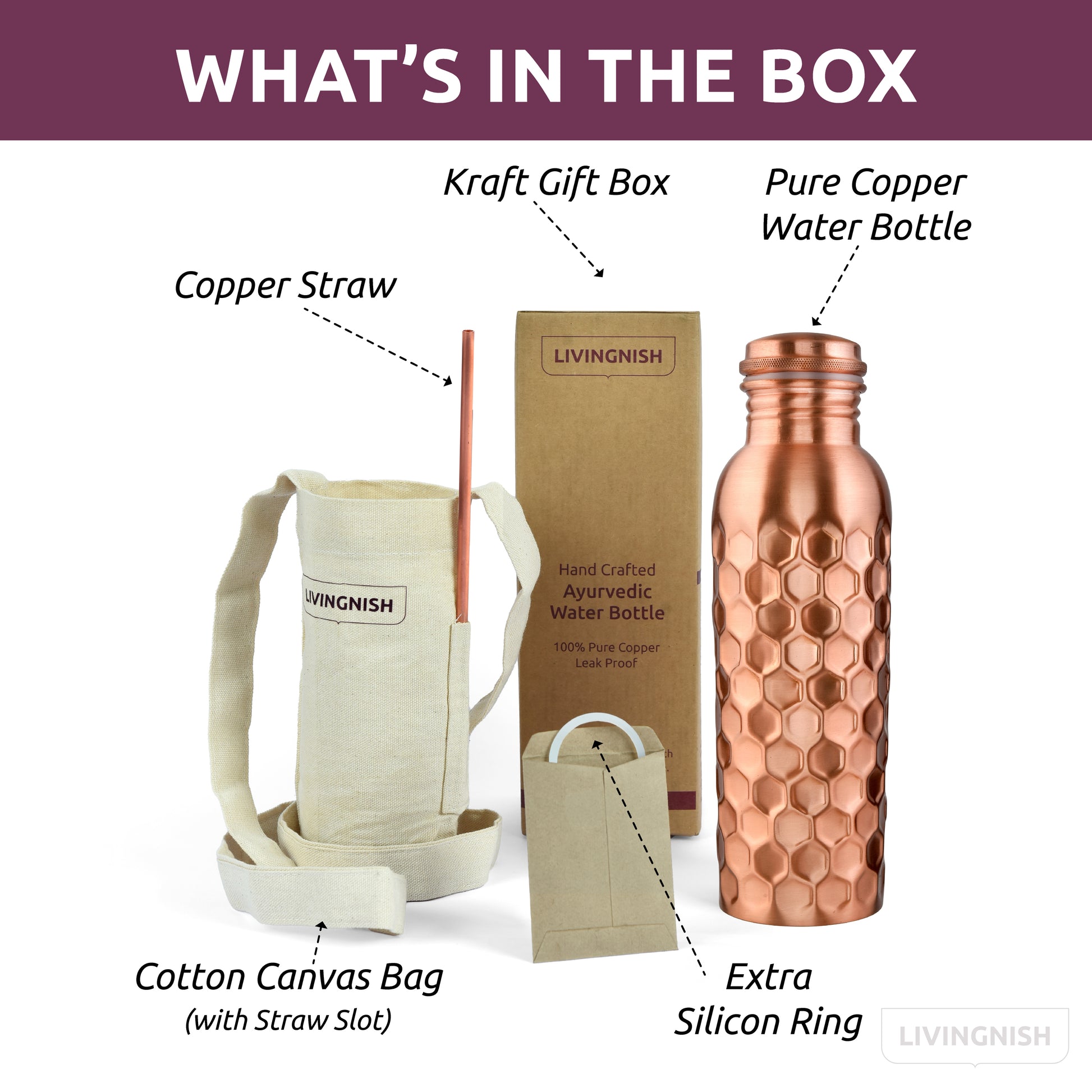 Honeycomb 100% Pure Ayurvedic Copper Water Bottle with Free Straw and Canvas Bag